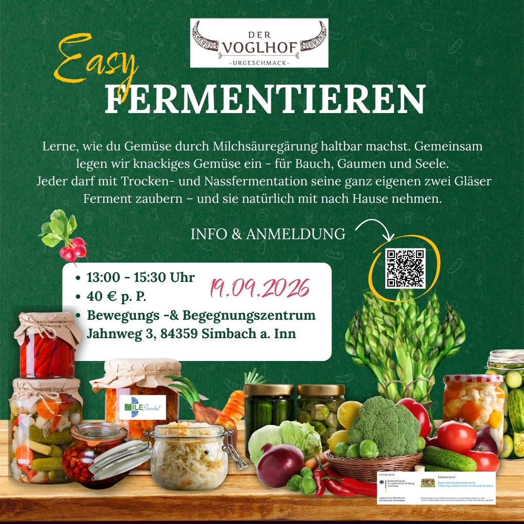 Lerne mit Karin vom Voglhof, wie du Gemüse durch Milchsäuregärung haltbar machst. Gemeinsam legen wir knackiges Gemüse ein - für Bauch, Gaumen und Seele.